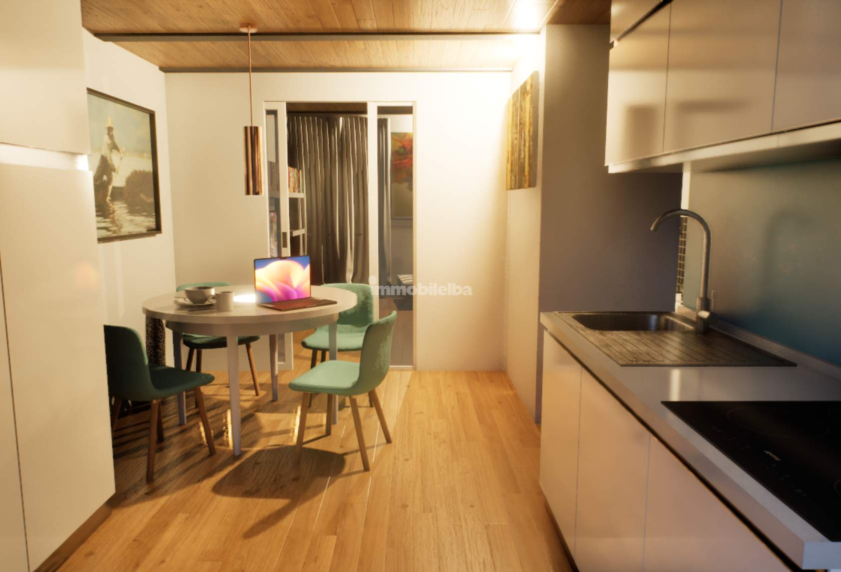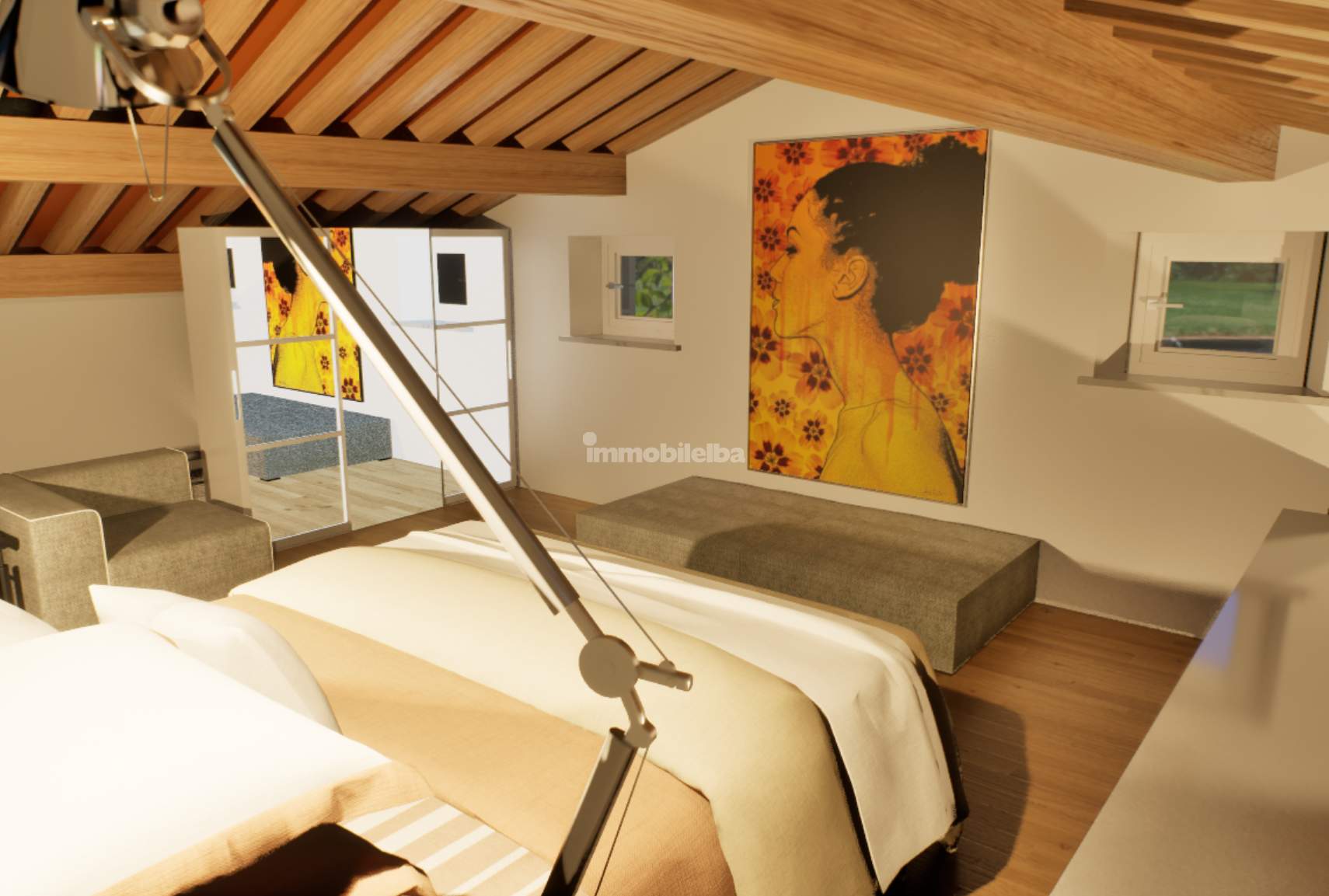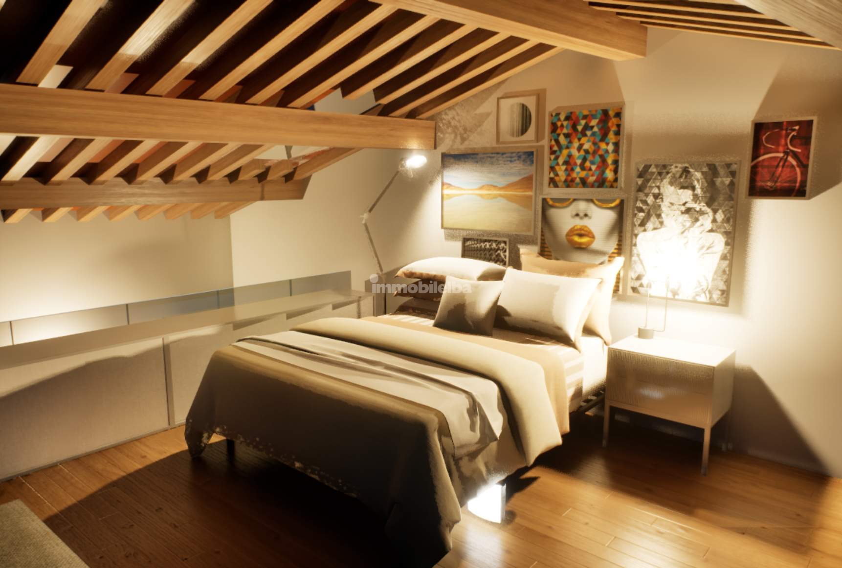Auf den Fotos sind sowohl der aktuelle Zustand der Immobilie als auch eine Projektvisualisierung zu sehen, die hilft, sich die Umwandlung in Wohnraum besser vorzustellen.