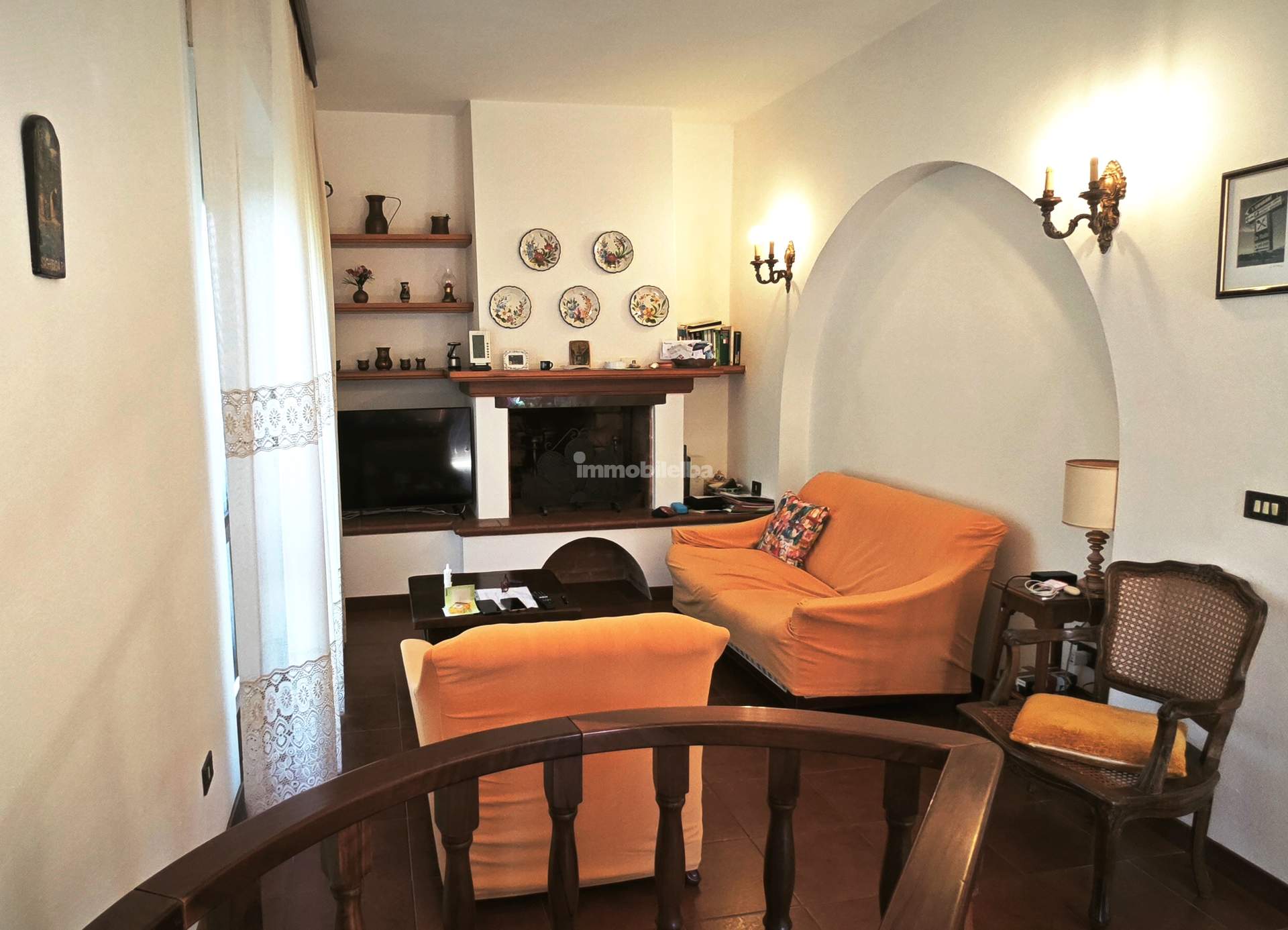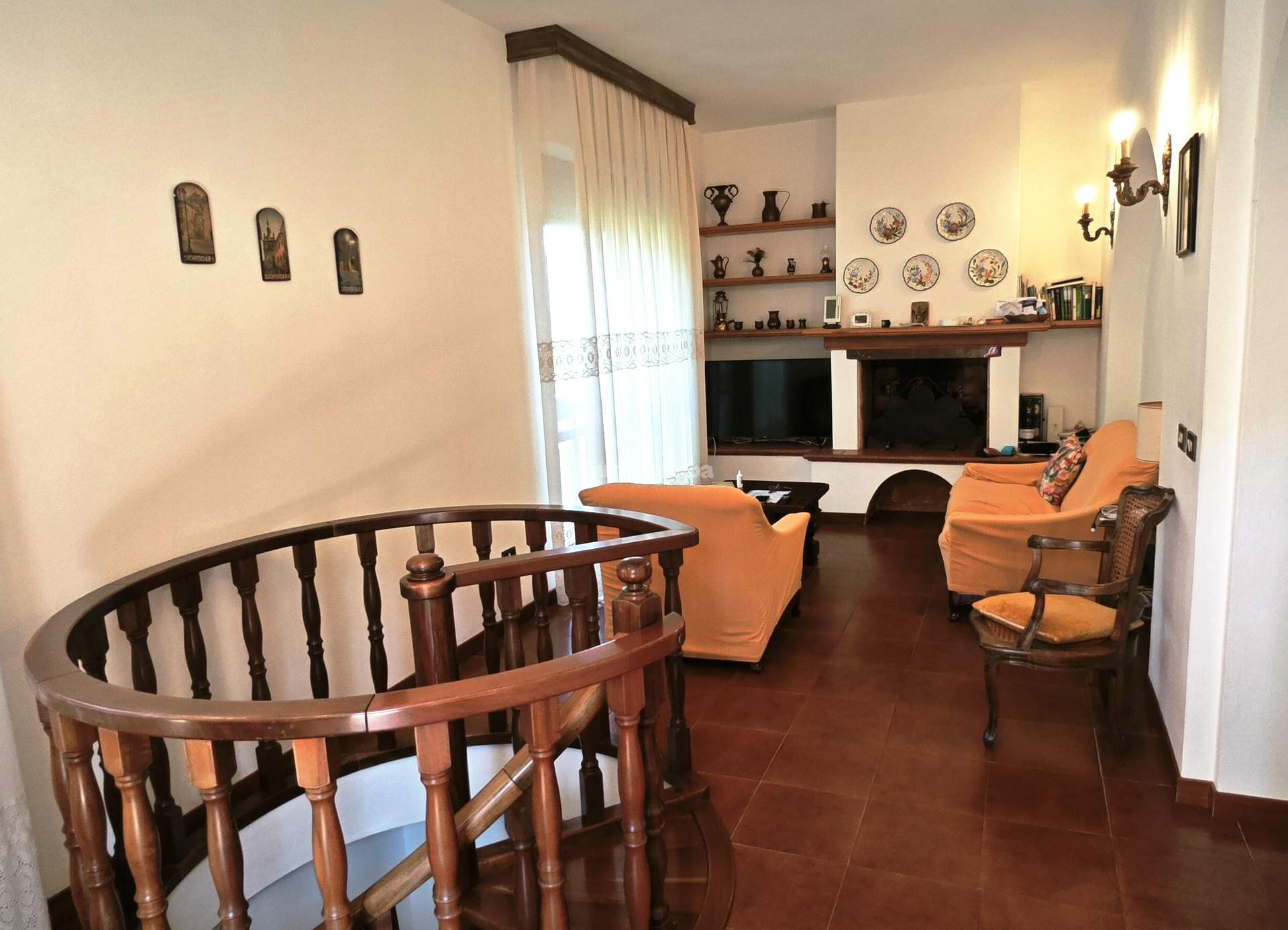 Im Erdgeschoss finden wir das große Wohnzimmer, eine Wohnküche, ein Badezimmer, einen Abstellraum und ein kleines Gästezimmer, sowie einen Keller und einen Technikraum. Im Obergeschoss, das sowohl über einen eigenen Eingang als auch über eine interne Holztreppe zugänglich ist, gibt es ein weiteres Wohnzimmer mit Kamin, drei Schlafzimmer, ein Arbeitszimmer, ein Badezimmer, einen weiteren Abstellraum und eine umlaufende Terrasse.